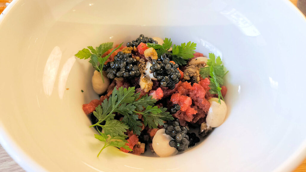 V Zátiší was closed in August and the first part of September for a refurbishment and a refresh of its concept—what they now describe as “A new concept, a modern interpretation of Slavic flavours from farms and forests, with stories of the landscape and a dash of boldness.” I’d have happily shortened that to: “Contemporary Slavic flavours with a daring touch.”