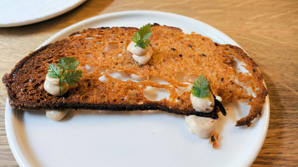 The accompanying ultra-crisp bread was sliced so thinly it functioned mostly as crumbs, and it, too, carried a generous smear of the marrow/mayo. The artificial “caviar” doesn’t taste of much, but it does add a nuance the beef tolerates well enough. Still, my lingering memory of the dish is “smoked richness”.