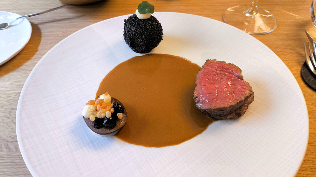 Main: Beef tenderloin, plum, “škubánek” dumpling, cream (sauce)